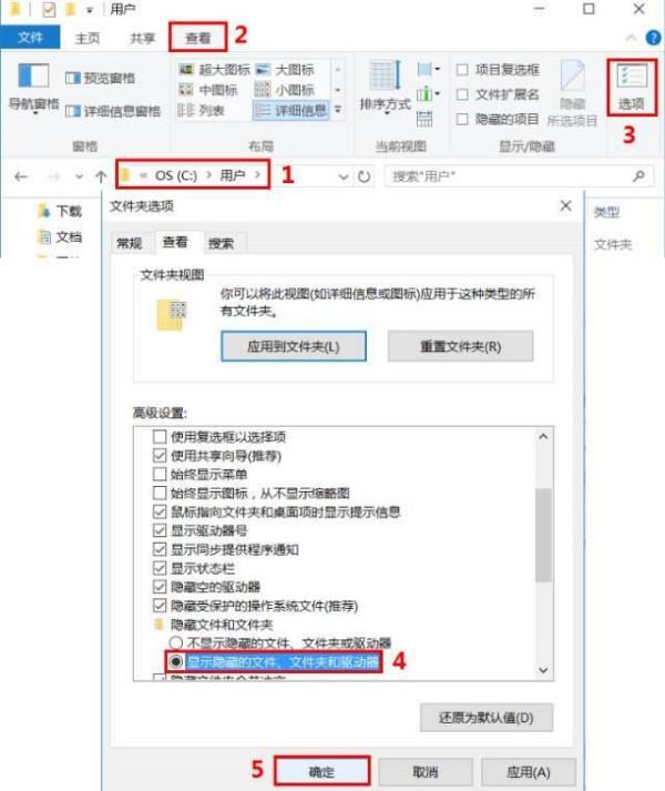 2、AppData为隐藏状态,可进入文件资源管理器“查看”---“选项”---“查看”---选择“显示隐藏的文件、文件夹和驱动器”取消隐藏