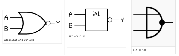 或非门有3种逻辑符号,包括:形状特征型符号(ANSI/IEEEStd 91-1984)、IEC矩形国标符号(IEC 60617-12)和DIN符号(DIN 40700),以二输入或门为例,逻辑符号如图所示: