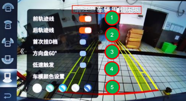 4) 方向盘 60°:打开后,在非 360 地显示界面,车辆方向盘转角≥60°且车速小于 15km, 显示“全景+前左/右轮”界面;