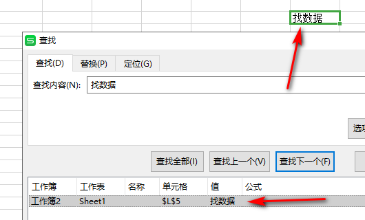 4、点击查找全部后,底下就会出现数据的单元格,而鼠标也会选择数据所在单元格。