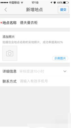 5、进入“新增商户”根据要求添加地点名称就是店名、添加照片添加店面门头照片或者店面照片;详细信息里可以添加电话,联系方式添加有效的手机号,因为高德地图那边的审核人员会打电话确认。