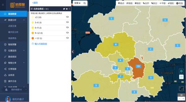 推荐试试使用地图慧,可以把各个网点快速标记在地图上,而且可以根据业务需要把这些网点自由画区(按照行政区块、按实际业务区域等),并且还可以对划分完的区域进行业务统计、数据分析,只需要将各个区域的数据一键上传即可在地图上生成数据情况,如下图所示