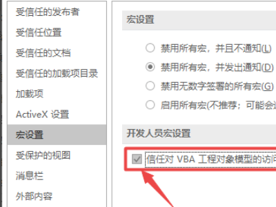 4、最后,在弹出的“信任中心”对话框中,在界面左侧中选择“宏设置”选项,勾选“信任对VBA工程对象模型的访问”这一项,然后单击“确定”即可,如下图所示。这样,问题就解决了。