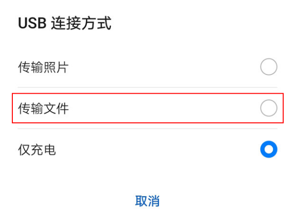 将连接线插入手机,弹出连接方式,选择“传输文件”。