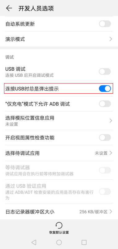 打开“开发人员选项”,下拉屏幕,可以找到“连接USB时总是弹出提示”,打开选项。