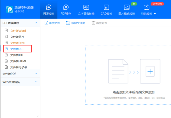 1、首先选择转换模式。选择“文件转PPT”。功能较多的PDF转换成PPT转换器可以进行包括常见的PDF转PPT、PDF转换Excel、PDF转图片等模式的转换。