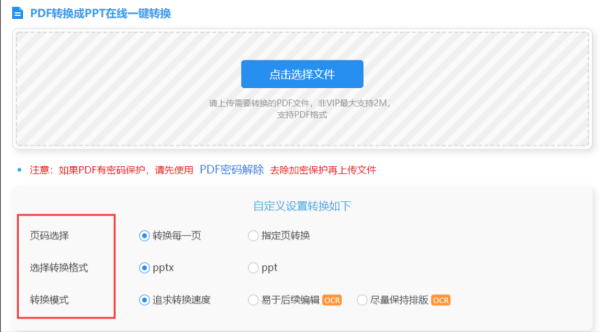 支持页码选择;PPT和PPTX两种格式;转换模式选择