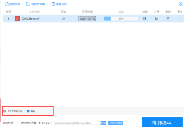 打开软件,在PDF转换选项中找到「文件转PPT」功能,上传PDF文件,即可开始转换,这里支持OCR功能(可以把纯图片转换成可以编辑的文字)。