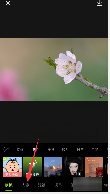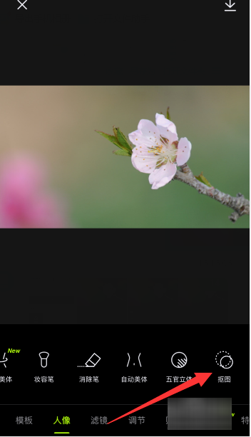 2、这时选择需要抠图的素材,再点击底端的人像功能,滑动功能栏到最右侧,再点击抠图功能。