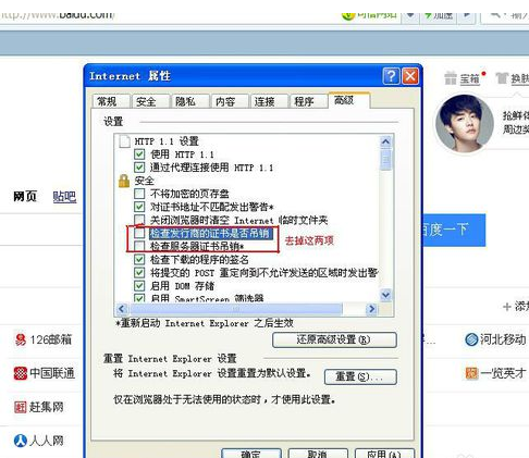 在出现的“Internert属性”窗口中找到“检查发行商的证书是否吊销”和“检查服务器证书吊销”,将这两项前面的对勾去掉。