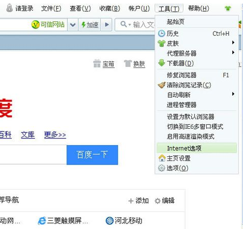 打开浏览器,然后打开工具菜单栏,选择“Internet选项”。