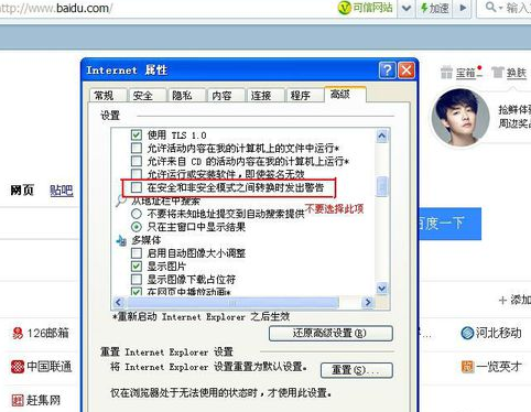然后将”在安全和非安全模式之间转换时发出警告“前面的对勾去掉。