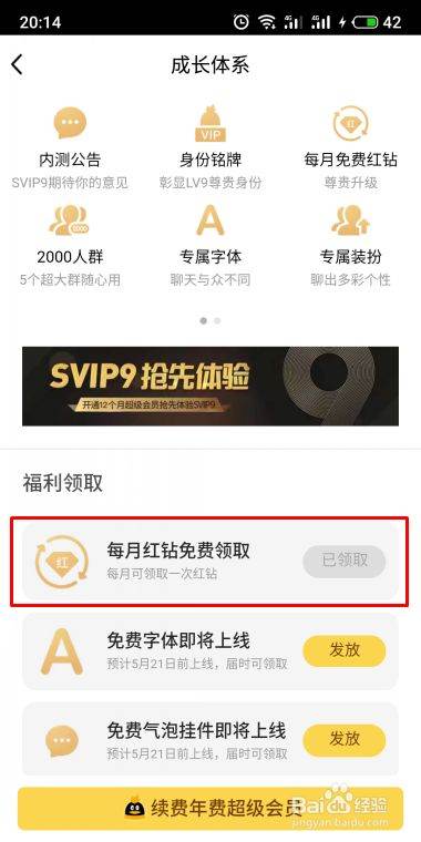 进入超级会员特权界面,往下拖动,找到“福利领取”界面。这里就可以看到“每月红钻免费领取”按钮了,点击即可领取。