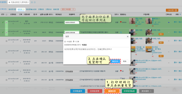 6、发货:筛选已打印的订单,勾选订单,点击发货,单号会同步到店铺后台。