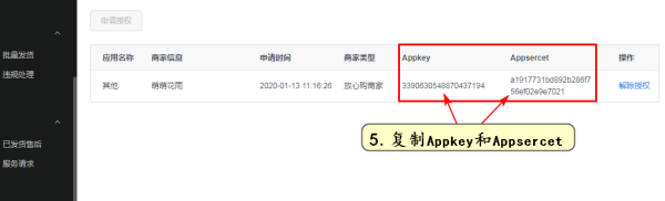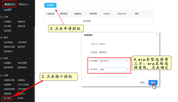 2、进入后-->点击左侧店铺-->点击接口授权-->点击申请授权,弹窗选择erp类型:其他,可获取appKey和appSecret