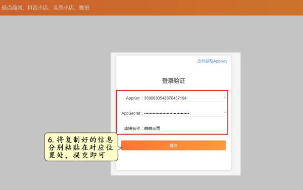 4、输入已获取的对应的APPkey ,AppSecret,提交登录可进入店管家页面