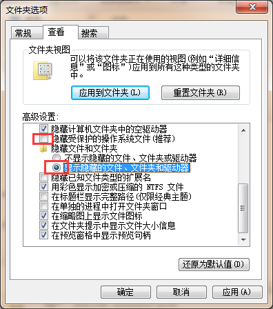 然后选择查看在查看下面的高级设置里找到“隐藏受保护的文件”取消勾选“,点选“显示隐藏文件,文件夹”,再回到C盘的“用户”文件夹下就可以看到AppData文件夹了。