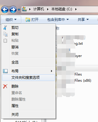 1、打开计算机,点击打开C盘后,点击组织菜单下文件夹和搜索选项命令;
