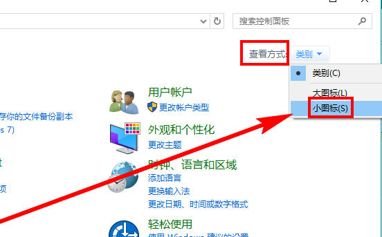 2.在【控制面板】右上角位置,把【查看方式】更改为“小图标”