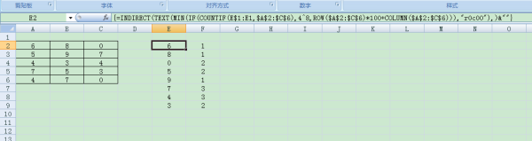 E2=INDIRECT(TEXT(MIN(IF(COUNTIF(E$1:E1,$A$2:$C$6),4^8,ROW($A$2:$C$6)*100+COLUMN($A$2:$C$6))),"r0c00"),)&""