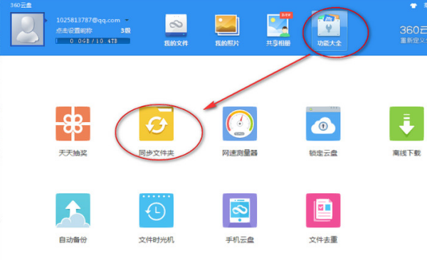 1、首先登录360云盘,点击功能大全,点击同步文件夹。
