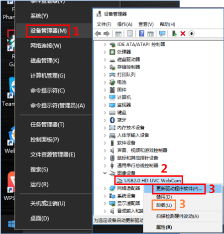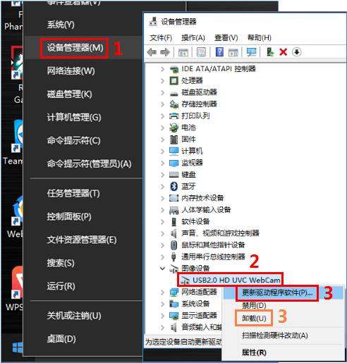 1、可以右击开始菜单进入【设备管理器】,双击【图像设备】,右击摄像头设备选择【卸载】,按提示完成并重启;