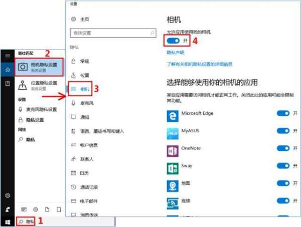 在搜索框输入【隐私】,选择【相机隐私设置】,在弹出窗口点击【相机】,将“允许应用使用我的相机”设为【开】