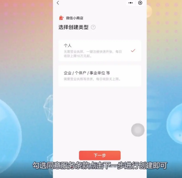 进入之后,选择创建店铺的类型,勾选同意服务条款点击下一步进行创建即可。