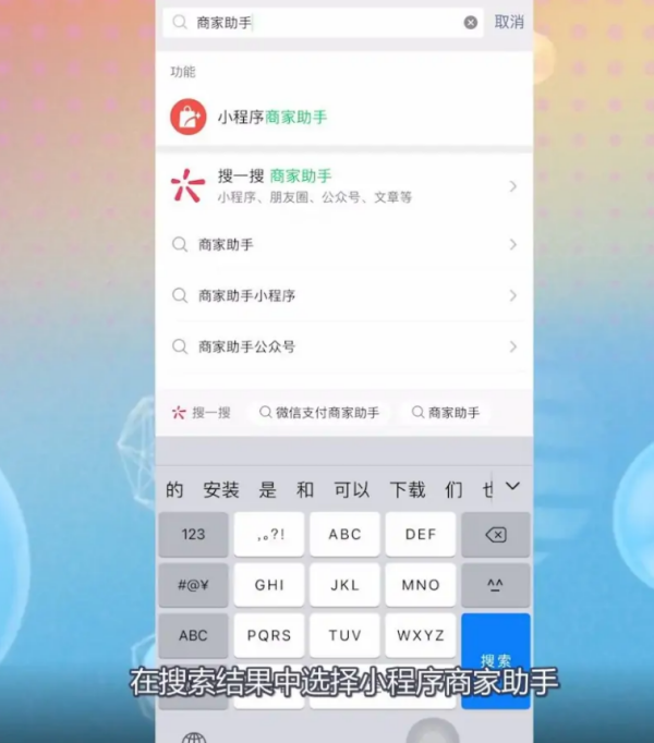 进入微信,在搜索栏里面输入搜索商家助手,在搜索结果中选择小程序商家助手。