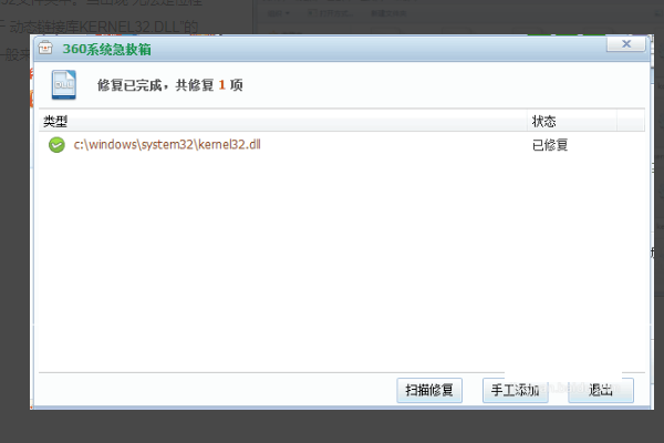 7、在页面上输入“kernel32.dll”,然后点击“添加”,即可修复kernel32.dll,如果在手工添加kernel32.dll提示没有丢失时,我们需要将原来C:/Windows/system32文件夹中的kernel32.dll删除或者剪切到其他目录。