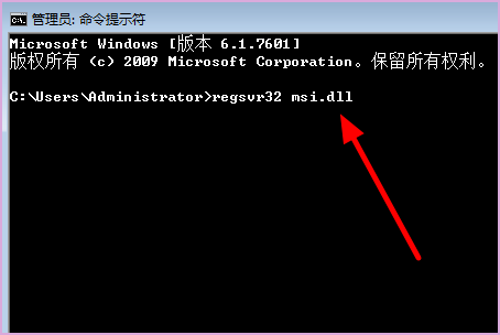 3、然后在弹出来的窗口中点击输入“regsvr32 msi.dll”,回车确定。
