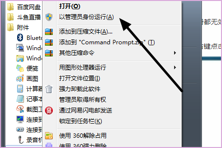 2、然后在弹出来的窗口中打开“附件”,右键单击“命令提示符”,选择“以管理员身份运行”。