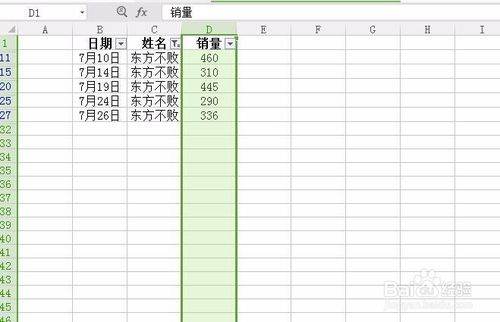 点击姓名右侧的三角标,出现了所有的人员姓名,逐个点击,选择【仅筛选此项】,就能单独筛选出一个人的所有销量明细。用鼠标点击D列,在表格下方则自动求和了销量,然后手动建立汇总表格,输入即可。这种方法不适用人数很多的,效率不是很高。