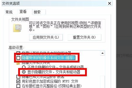 3、然后我们在弹出来的窗口中点击打开“查看”打勾“显示隐藏的文件、文件夹和驱动器”,回车确定即可。