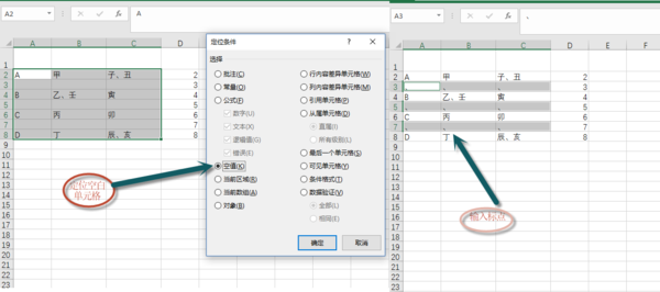 3. 对排序后的数据中,空白单元格中添加标点,拖拉选择数据区域,按Ctrl+G,再点“定位条件”,选择“空值”,就选择全部空白单元格。输入标点符号,这里是顿号(、),按Ctrl+回车,就在所有空白单元格中输入了顿号