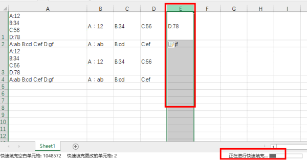 用同样的方法填充C、D、E列,如下图,自动填充整列数据。(如果内容较多,需要较长时间的等待)