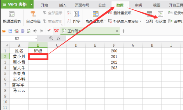 1、首先设置下拉列表:点击B2单元格,点击“有效性”。
