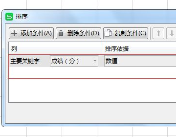 4、点击排序,出现下图表格,在主要关键字里面选择成绩,排序依据下面选择数值,次序下面选择降序。