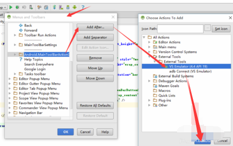 在toolbar空白处点击右键,选择Customize Menus and Toolbars。然后导航到Main Toolbar>Add After>在弹出的面板中找到External tool>VS Emulator (4.4 API 19)然后按OK。如下: