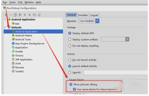 打开Android Studio>Run>Edit Configurations>Defaults/Android Application/General 选项卡的Target Device节点,勾选Show chooser dialog和Use same device for future launches。记得不要忘记点Apply和OK。如下图: