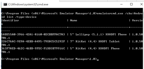 Parameters:添加启动模拟器的参数,/sku:Android是说明打开Android的模拟器,/id:后面的Guid是模拟器的唯一 编号,总的意思是指定要启动哪一个Android模拟器。id可以通过emulatorcmd.exe /sku:Android list /type:device获得,如下: