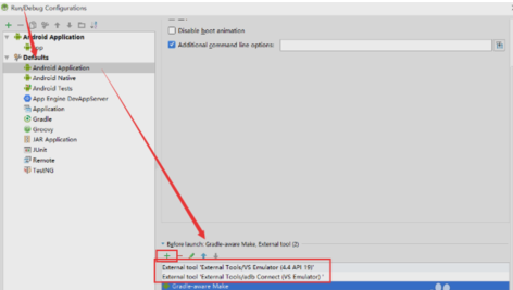 打开Run>Edit Configurations>Defaults/Android Application/Emulator 选项卡的BeforeLaunch节点,把我们刚才创建的两个External Tool添加到此处,记得不要忘记点Apply和OK,顺序如下: