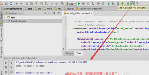第三节的按钮只是启动了模拟器,但是Andorid Studio还无法连接到模拟器,这里就要使用adb命令来连接到刚才启动的模拟器上。