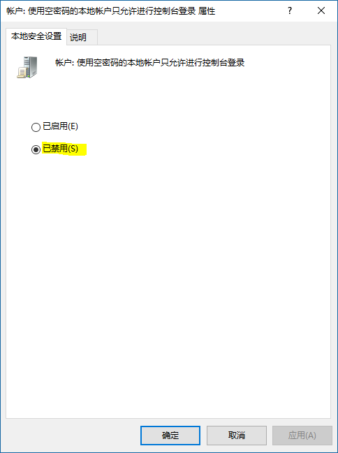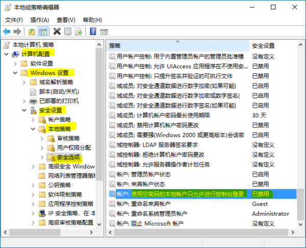 然后,在打开的组策略窗口中,依次选择计算机配置→Windows 设置→安全设置→本地策略→安全选项,然后在右边窗口中找到账户:使用空密码的本地账户只允许进行控制台登陆选项,双击打开。
