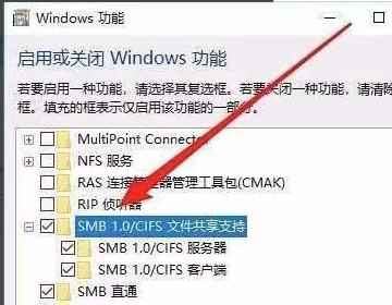 4、最后在窗口中勾选“SMB 1.0/CIFS文件共享支持”前面的复选框,把其下面所有的勾选全部选中即可。