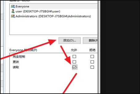 5、点击权限-添加Everyone用户可以访问此共享文件夹。这是在无法共享的时候排除是账号权限问题。若没有此问题,建议还是不要使用的Everyone用户。要以指定可以访问共享的用户。