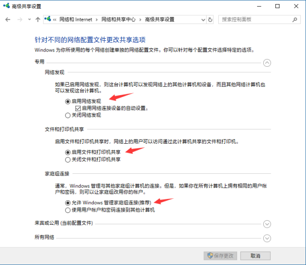 通过 Cortana 输入高级共享设置,打开高级共享设置 对话框,按照下面选择即可: