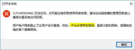 2.如果被访问的电脑出现了这个提示:用户账户限制阻止了此用户进行登录。例如:不允许使用空密码,登陆次数限制,或强制实施的某个策略限制。这个提示如果是第一次出现的话,绝大部分是组策略不允许使用空密码的原因。