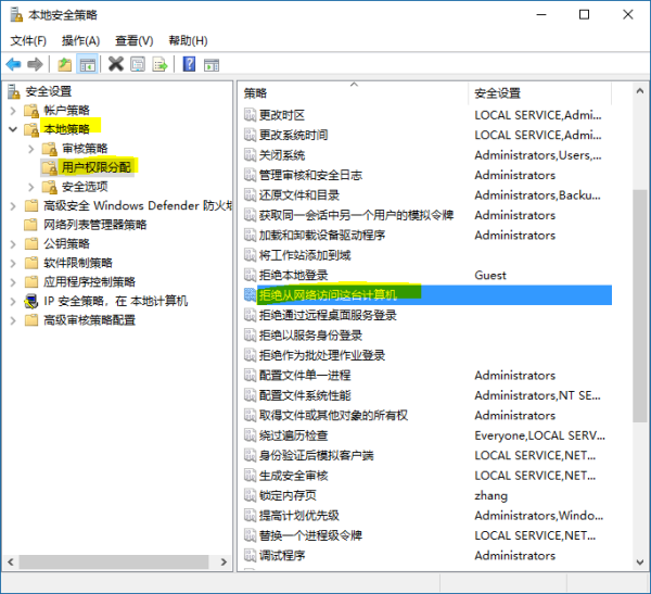 然后,在打开的本地安全策略左边窗口,依次选择安全设置→本地策略→用户权限分配,然后在右边窗口找到拒绝从网络访问这台电脑,双击打开。