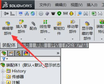 2、选中零件之后,点击左上角装配体里的编辑零部件,如下图所示。